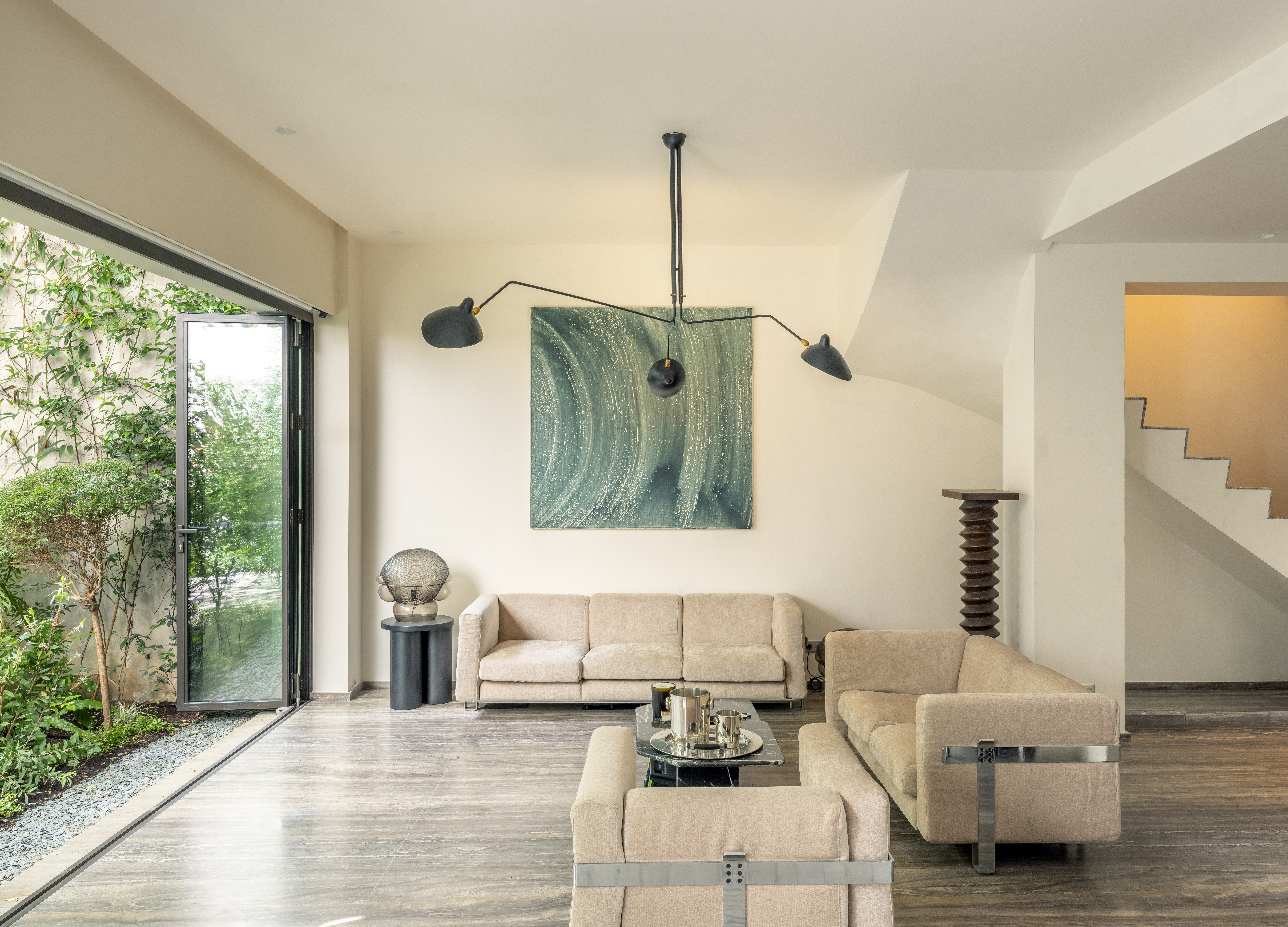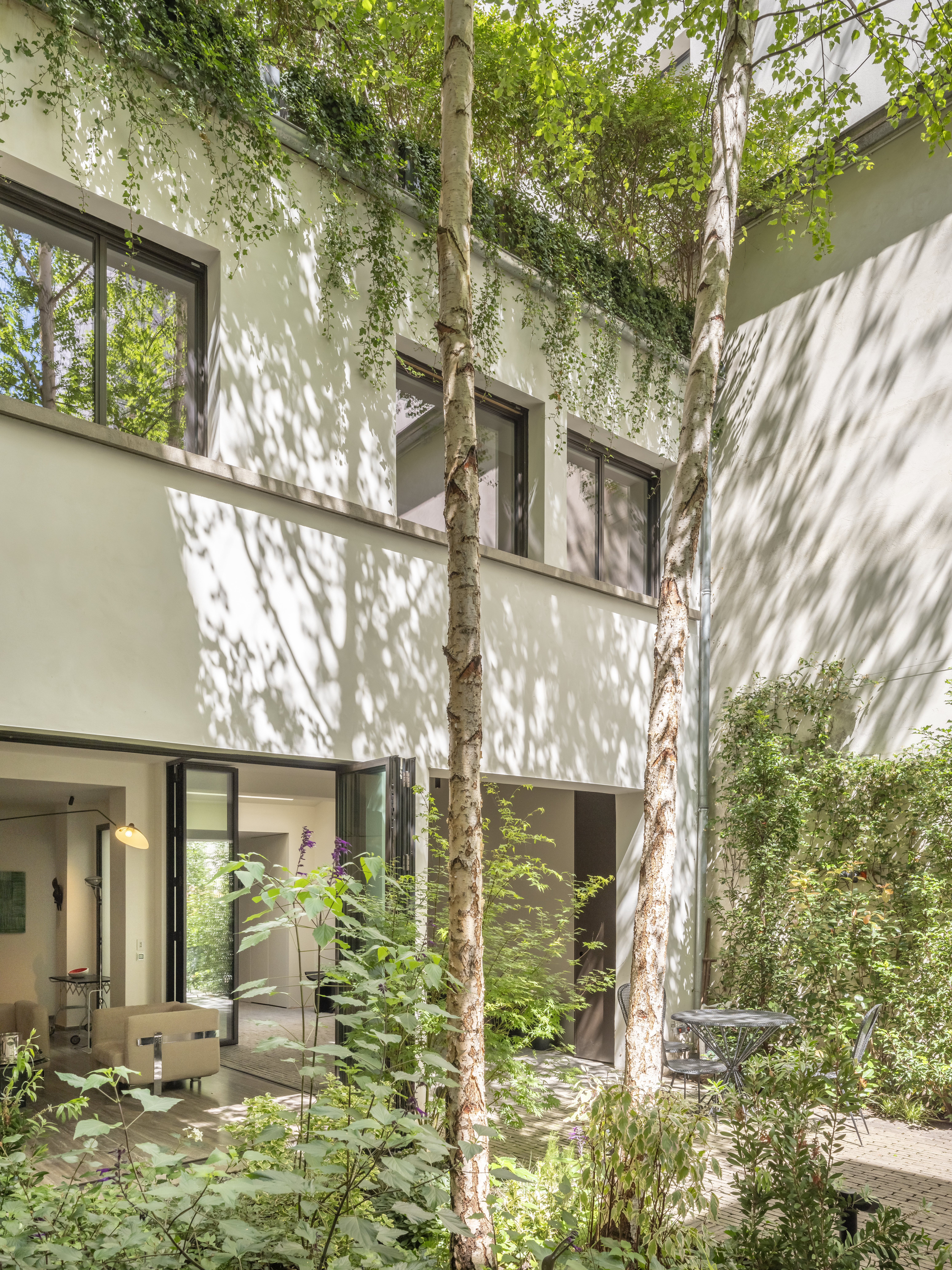 Le volume de cette maison mono-orientée se caractérise par une façade unique qui n'a pas de vue directe sur la rue. Elle s'élève sur trois niveaux, dont deux à l'alignement et une partie en attique en retrait d'environ 4 mètres.